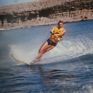 Long legs, broad hands. Chunky feet. Out on the boat, hydrosliding. Holding the ski rope hands in lap to keep a perfect balance on the board as you hit those waves, up and down. Wet hair in the wind, free as a bird.